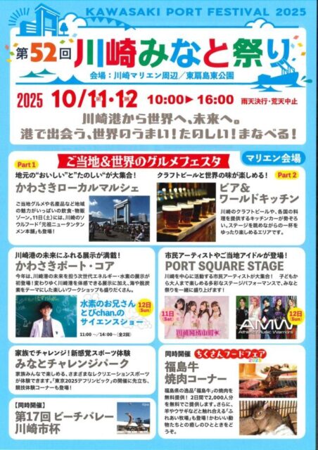 川崎港を舞台に、海と港の魅力を丸ごと体感できる「第52回川崎みなと祭り」が開催されます。会場は川崎マリエン周辺・東公園エリア。海上自衛隊の護衛艦「ゆうだち」や海上保安庁の巡視船「いず」の一般公開をはじめ、ステージイベント、地元グルメが並ぶマルシェ、体験型ワークショップなどが行われる盛りだくさんの2日間です。港の役割や海の魅力を学びながら、家族みんなで楽しめる秋の定番イベントとして毎年大人気。船・海・音楽・食が融合する“港のフェスティバル”を楽しもう!