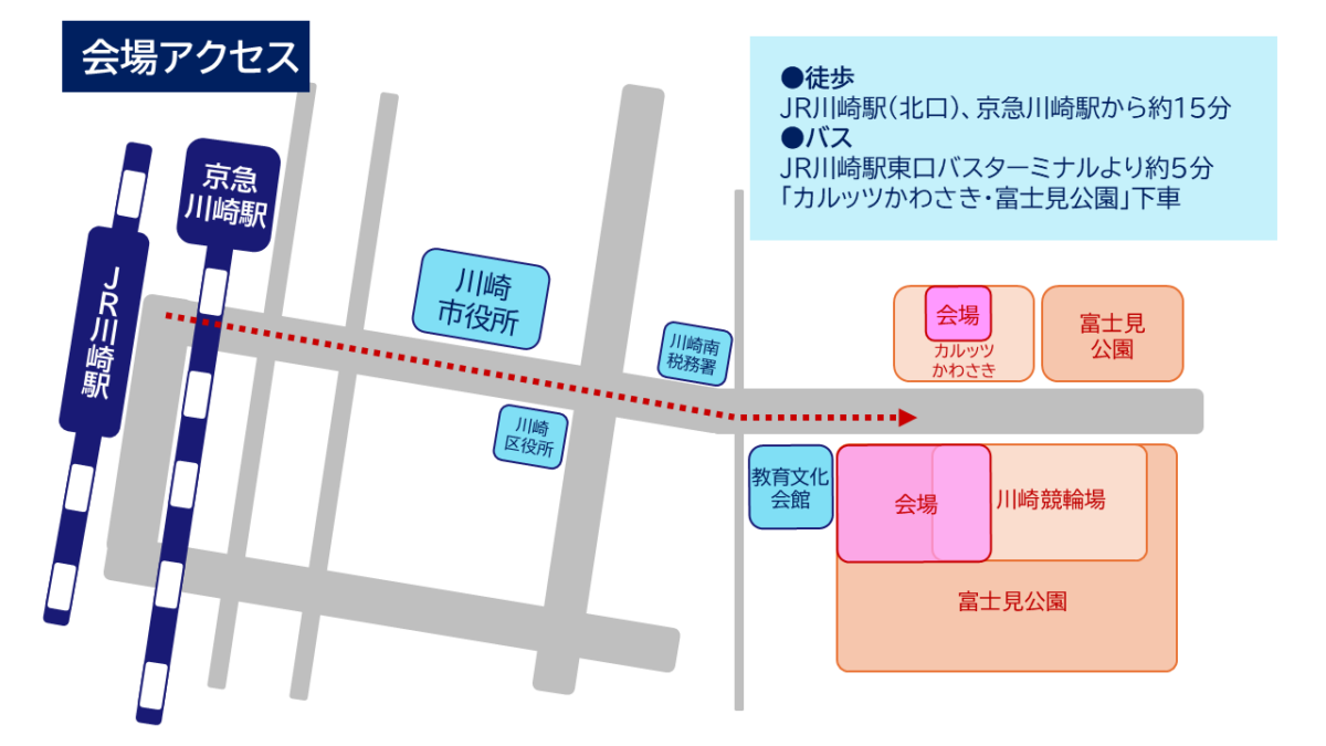 JR川崎駅・京急川崎駅から徒歩約15分/またはJR川崎駅東口バスターミナルより「カルッツかわさき・富士見公園」下車すぐ。