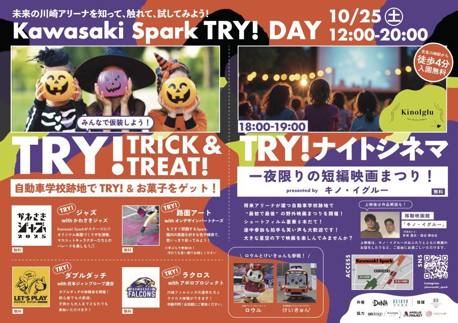 Kawasaki Spark TRY! DAYは、再開発を目前に控える川崎アリーナ予定地(元自動車教習所跡地)で開催されるラストイベント。音楽・映画・アート・スポーツをテーマに、「TRY!」を合言葉にした一日限りの体験型フェスです。ジャズステージやパレード、路面アート、スポーツ体験、そして夜には「キノ・イグルー」によるナイトシネマなど、多彩なプログラムが満載。子どもから大人まで楽しめる、地域と未来をつなぐ特別な一日です。
