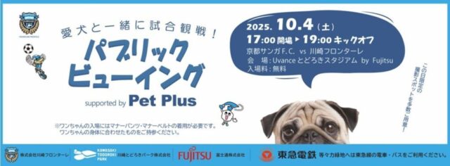 愛犬と一緒に楽しめる特別なパブリックビューイングが、Uvanceとどろきスタジアム by Fujitsuで開催されます。京都サンガF.C.戦を大画面で観戦できるほか、ワンちゃんと一緒に観戦できる専用エリアも用意されており、家族や愛犬とアットホームな雰囲気の中でサッカーを満喫できるイベントです。過去に大好評だったワンちゃんとの特別企画もさらにパワーアップして登場予定で、飼い主さんとワンちゃんにとって特別な時間になること間違いなしです。観戦は無料で、雨天でも実施されるので安心です。